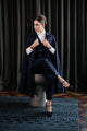 This striking navy three-piece business suit elevates traditional tailoring with a modern twist. The sharply tailored jacket, waistcoat, and trousers exude professionalism, while the addition of a dramatic cape lends an air of sophistication and boldness. The crisp white shirt and black tie contrast the deep navy, enhancing the sleek and polished appearance. Perfect for women seeking a powerful yet elegant look, this ensemble is both commanding and timeless, ideal for making a statement in any business setting.